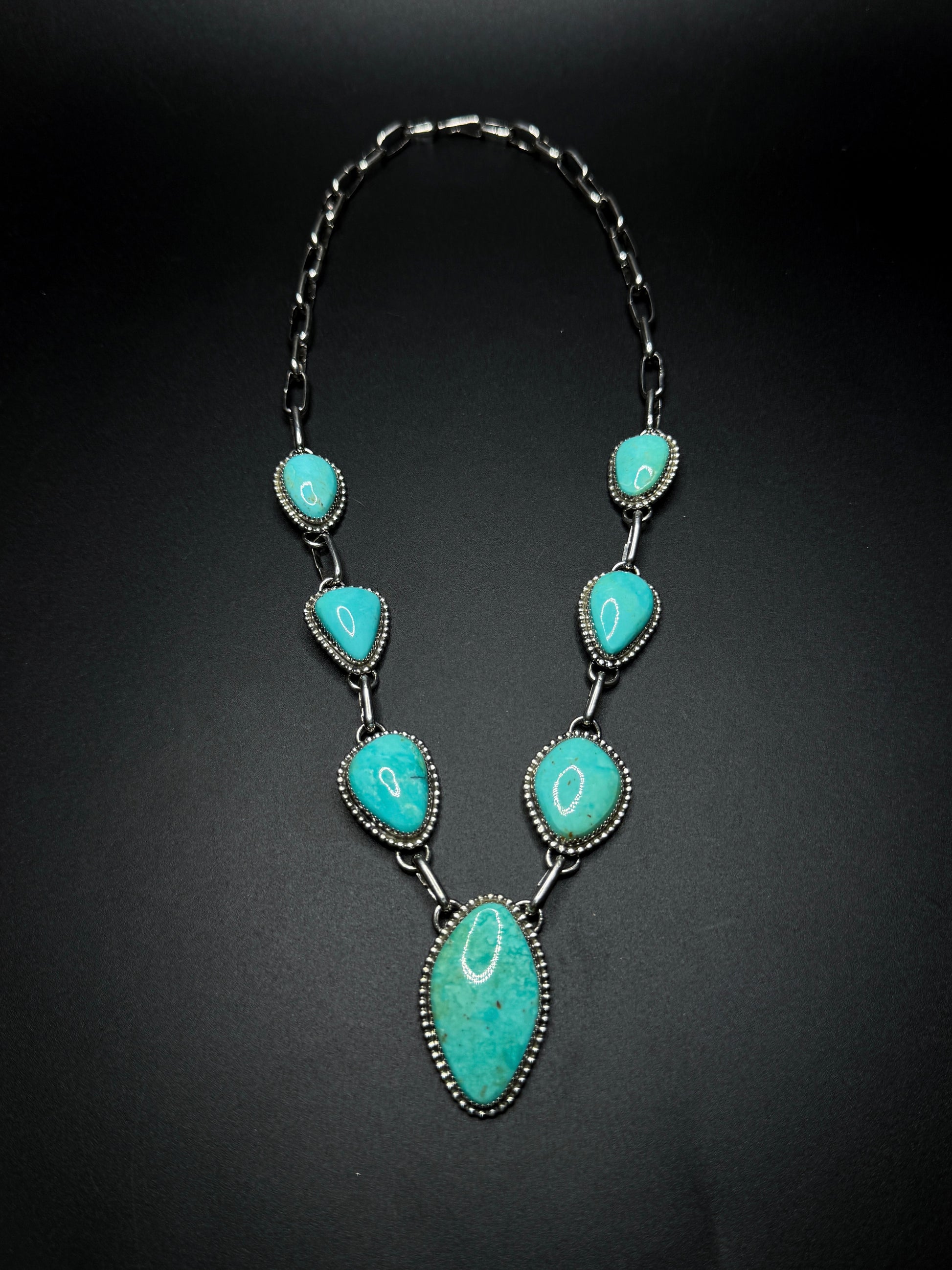 - Necklace – 20” handmade sterling silver paperclip chain with turquoise centerpiece – $1,200