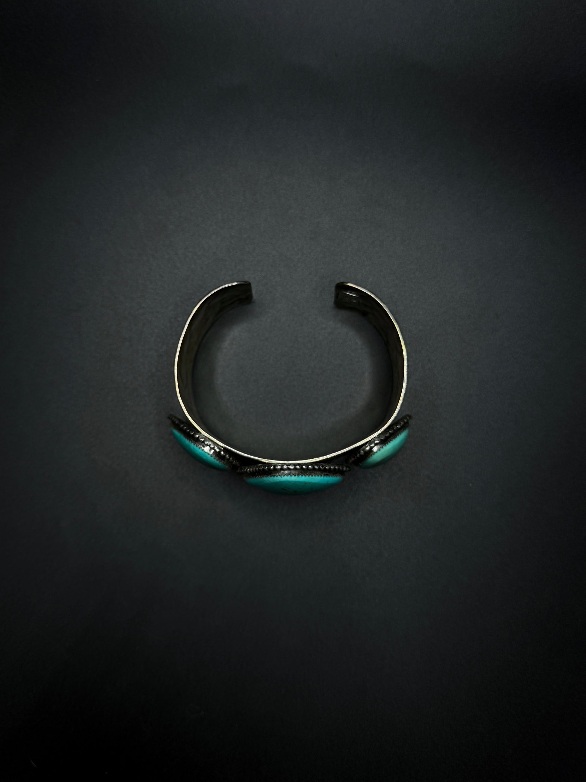 - Cuff Bracelet – 1” wide hand-hammered sterling silver band with turquoise stone, 6” length with 1” gap (slightly adjustable) – $420